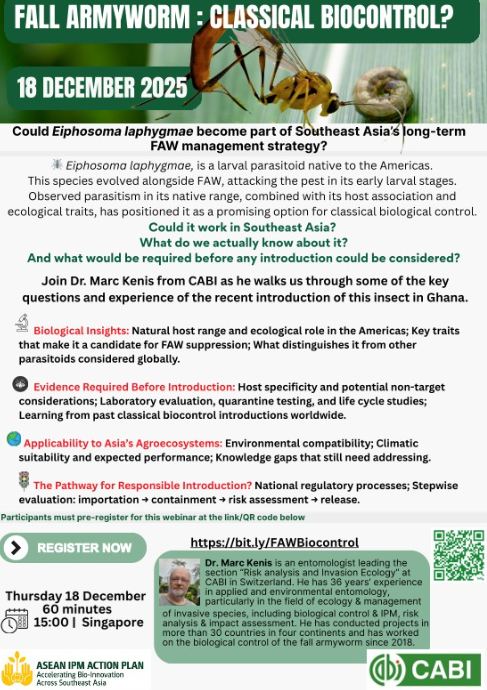 This webinar will be useful for policymakers, researchers, regulators, and practitioners working on IPM, biological control, and sustainable FAW management. We are also really keen to find all those classical biocontrol specialists out there - for a good discussion on the pros and cons of this approach!